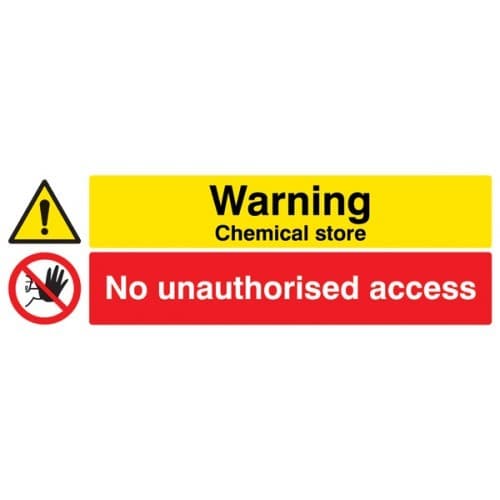 Multi-message signs provide multiple safety messages on one sign. This sign advises of a warning hazard (Warning, Chemical Store) and an action (No Unauthorised Access) that is prohibited.